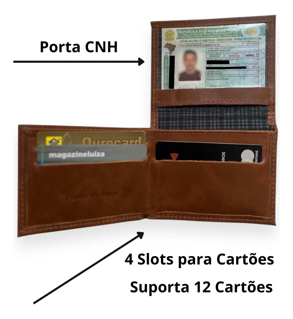 Possui compartimentos dedicados para CNH, cartões, dinheiro e documentos, mantendo tudo seguro e acessível. O couro legítimo garante mais durabilidade e um toque macio que melhora com o tempo.